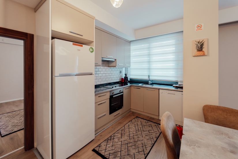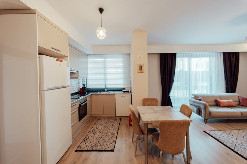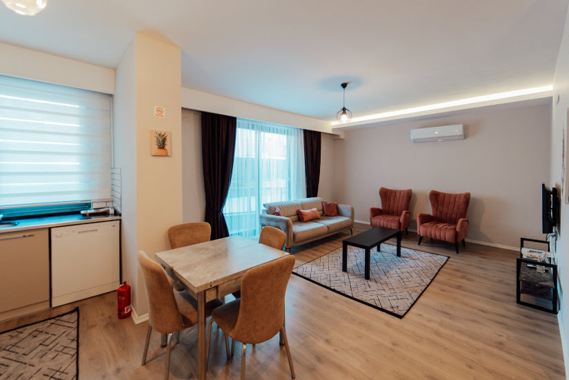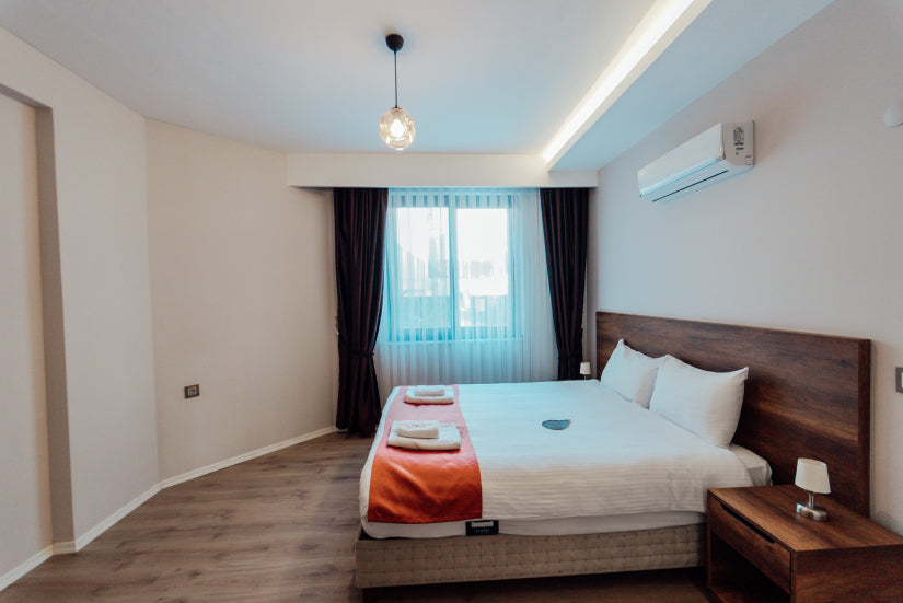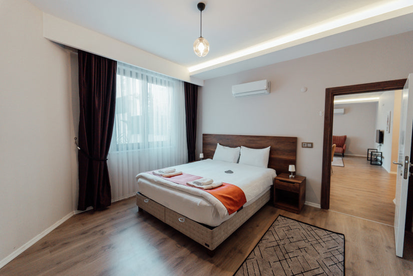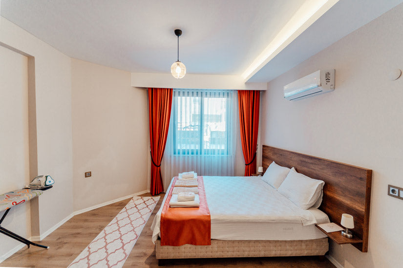 Our 1+1 suite has been designed in such a way that families of two can stay comfortably. You can enjoy your stay in our rooms with terrace view in a convenient location in Antalya's Finike district. Our air-conditioned suite has a bedroom, a TV and a sitting area, a fully equipped kitchen and a bathroom. In addition, our private car park and pool with terrace view are at your service.
