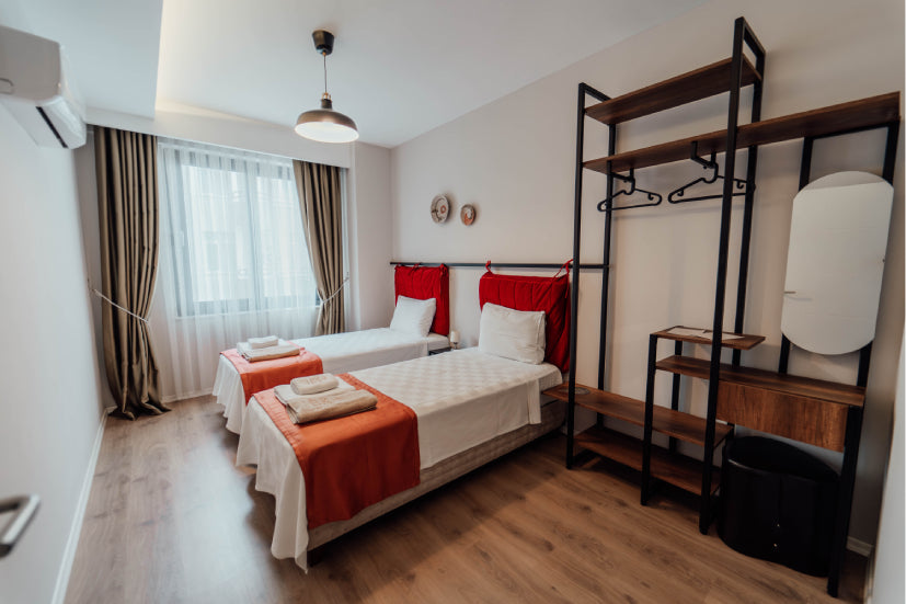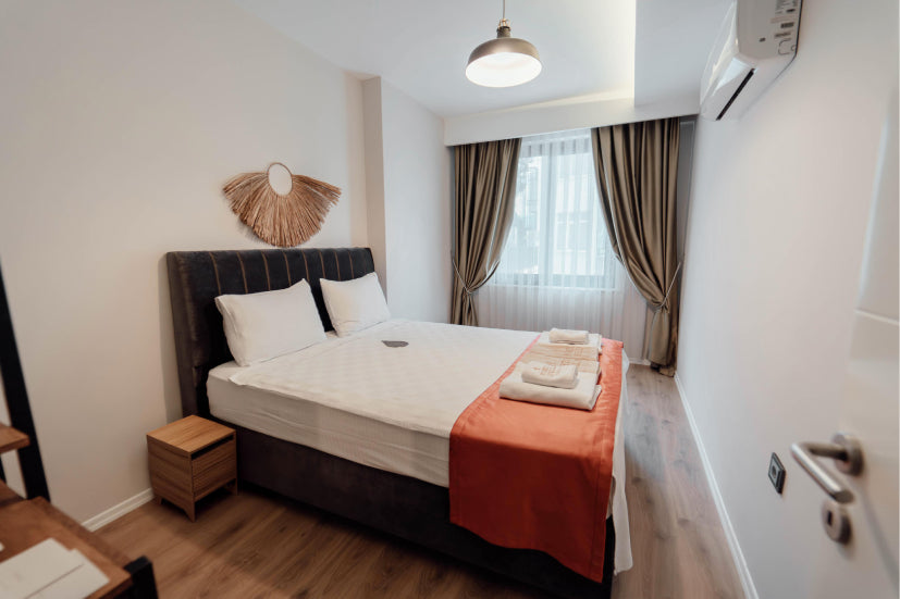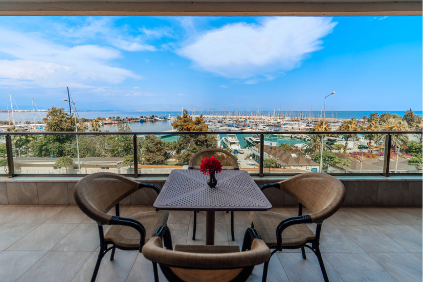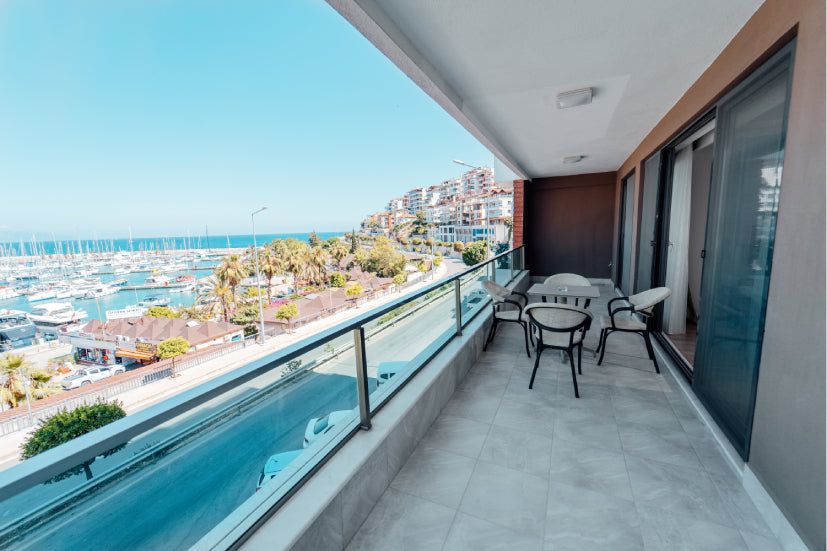 Our 2+1 suite, designed for families of 4, is located in Antalya's Finike district and offers a marina view from your balcony. Our air-conditioned suite, within walking distance of the city center and the sea, has 2 bedrooms, a TV and a seating set, a fully equipped kitchen and 1 bathroom. Our private car park and pool with terrace view are also at your service.