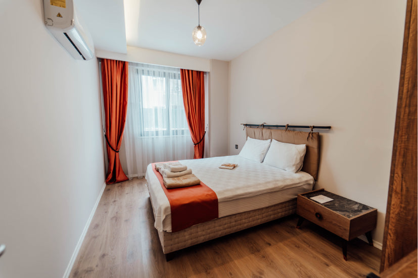 Our 2+1 Suite, designed for families of 4, has an ideal location in Antalya's Finike district. You will enjoy your stay in our apartment, which is within walking distance of the city center and the sea, by enjoying your balcony with a view of the marina. Our air-conditioned suite has 2 bedrooms, a living room, a fully equipped kitchen and 1 bathroom. Our private car park and pool with terrace view also offer privileges for you.
