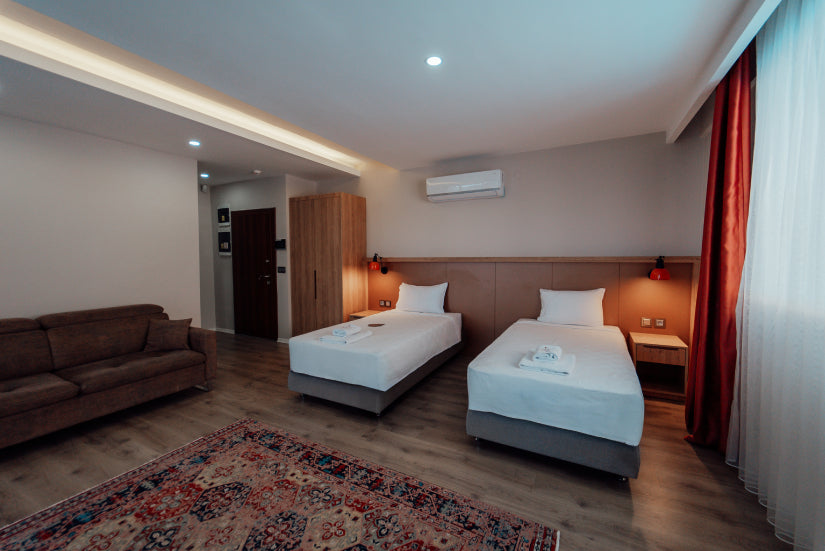 60 m2 genişliğinde ; 2 yetişkin + 1 çocuk konaklayabilir, avlu manzaralı ; Yatak odası, Salon, Banyo, tam donanımlı açık mutfak, balkonda sigara içilir. Kapalı otopark mevcuttur.