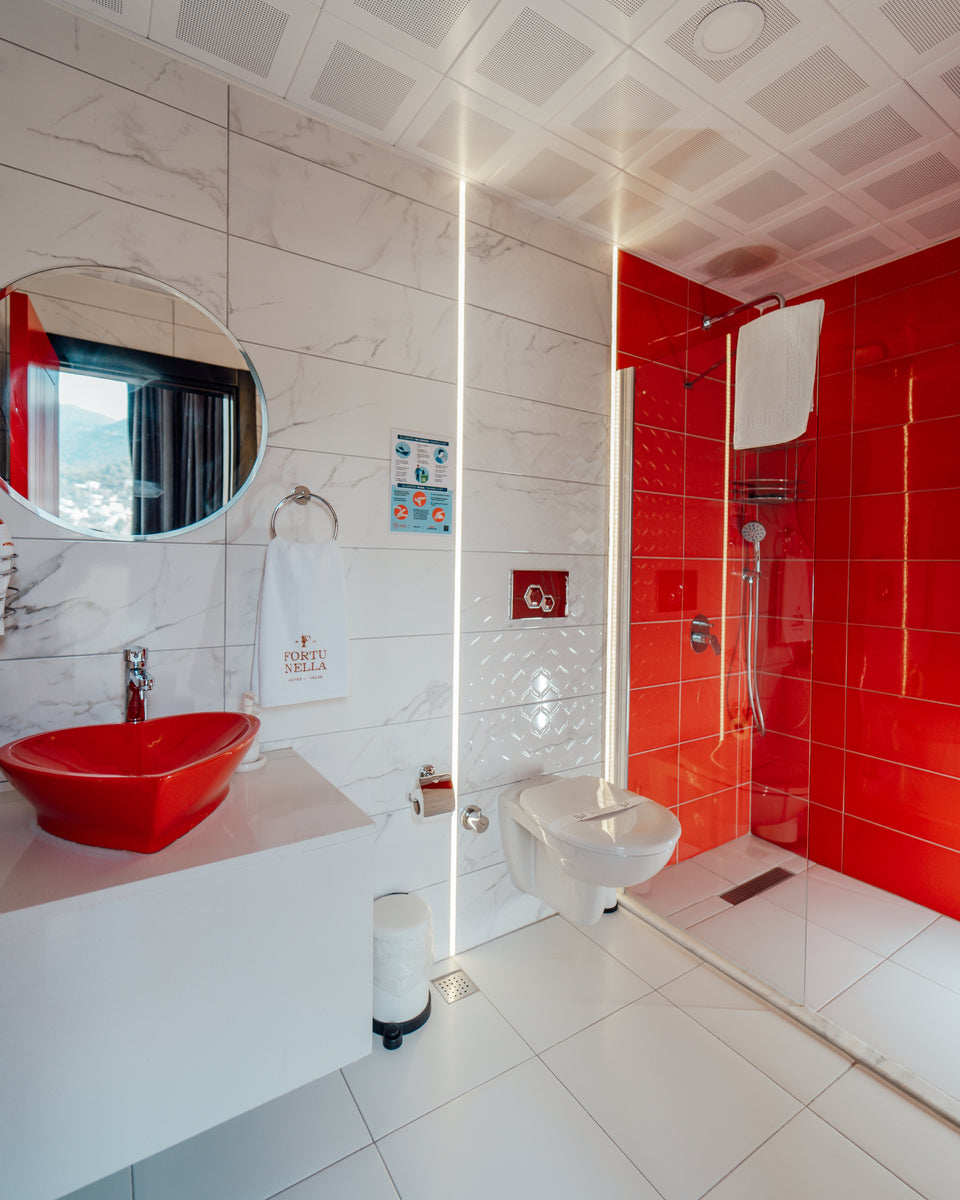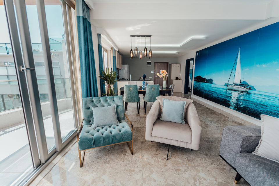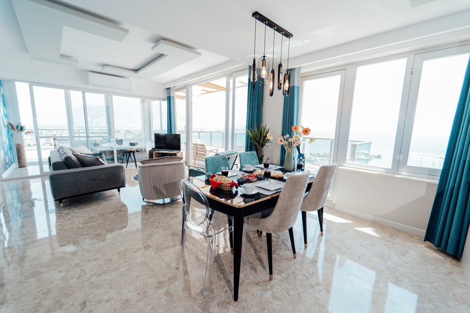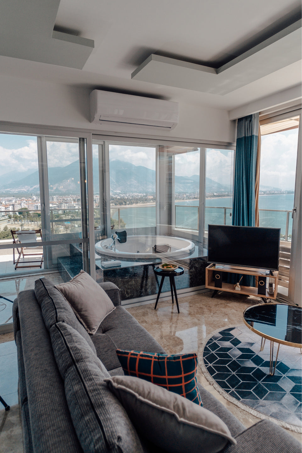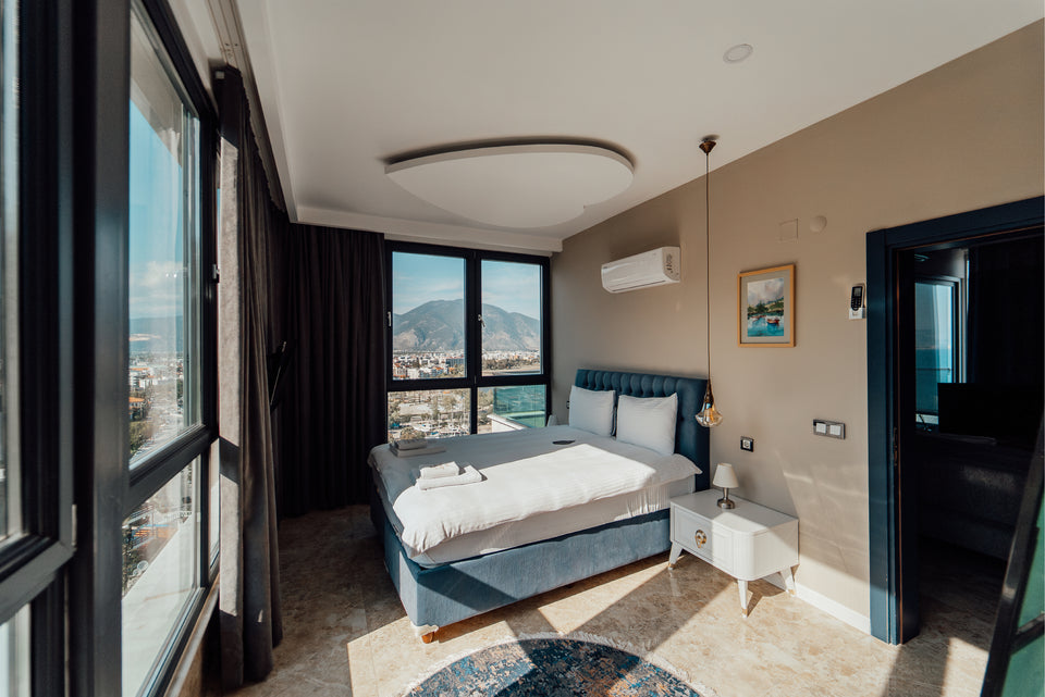 100 m2 genişliğinde, Full deniz manzaralı, 4 yetişkin+1 çocuk konaklayabilir. Deniz manzaralı jakuzi, 2 Yatak odası, Salon, 2 Banyo, tam donanımlı mutfak. Balkonda sigara içilir. Özel kapalı otopark mevcuttur.